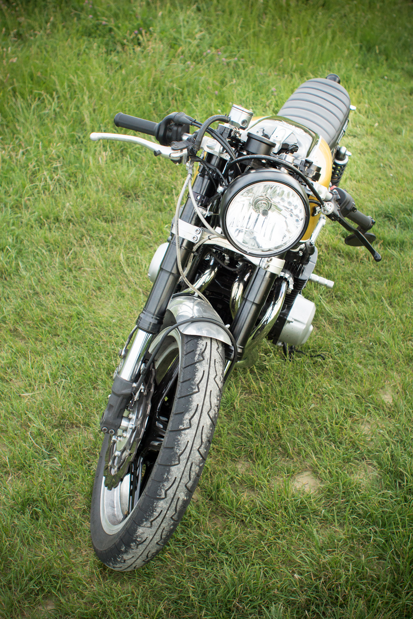 L’ adaptation d’une fourche inversée lui donne un freinage précis et puissant. Le réservoir a été retravaillé afin de lui adjoindre des emplacements pour les genoux. Le moteur bien évidemment entièrement démonté, révisé, et remis à neuf. Les demi-guidon aluminium assurent une position parfaite, et s’accordent avec le compteur digital. La selle biplace accueille une coque arrière en métal réalisée sur mesure lorsque madame ne participe pas à la ballade.
